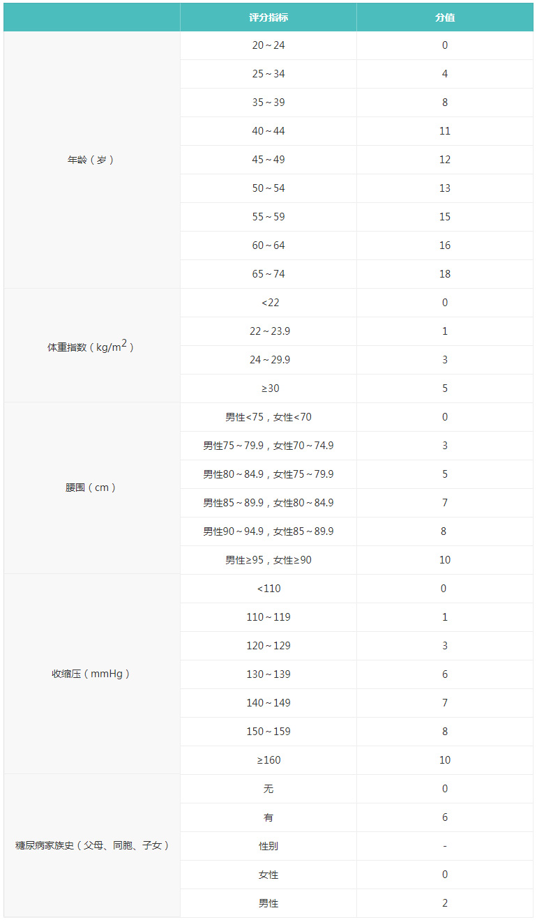 中国糖尿病风险评分表,对20~74岁的普通人群进行风险评估