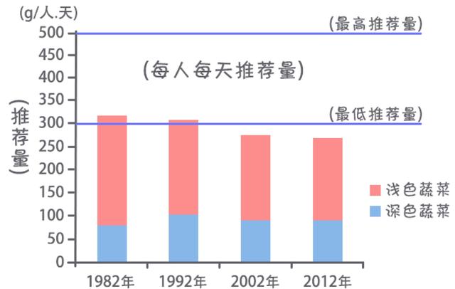 无论是中国还是美国针对于糖尿病前期的饮食建议都是鼓励选择富含膳食纤维的饮食方案,这些膳食纤维应该尽量来自蔬菜、豆类、水果及全谷物。然而我们实际摄入的新鲜蔬菜量和中国居民膳食指南推荐量相比仍有不足,并且随着近年饮食习惯的改变,还呈下降的趋势(如下图)。