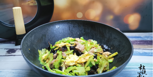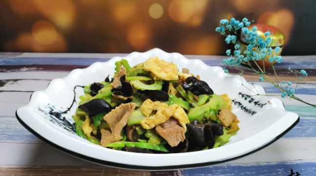 主料:苦瓜370克、精肉150克、鸡蛋2个、水发木耳50克