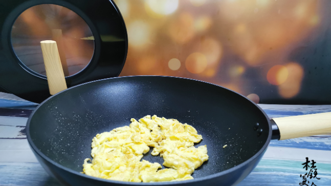 3、鸡蛋2个,清洗一下鸡蛋表面,这一步人们经常忽略,其实很有必要。把清洗干净的鸡蛋打入碗内,搅打成均匀细腻的全蛋液。锅内倒入植物油20克,油温七成热,约200度,下入鸡蛋液,快速炒散成块,炒至鸡蛋块表面呈现出诱人的金灿灿的颜色,立即盛出。