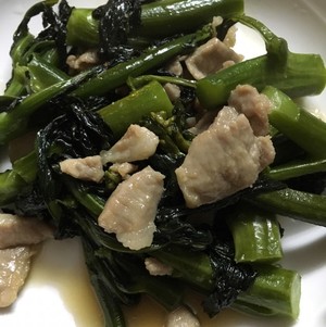 芥蓝300克,猪瘦肉50克,尖椒100克,葱、植物油、盐、酱油、鸡精花椒各适量。