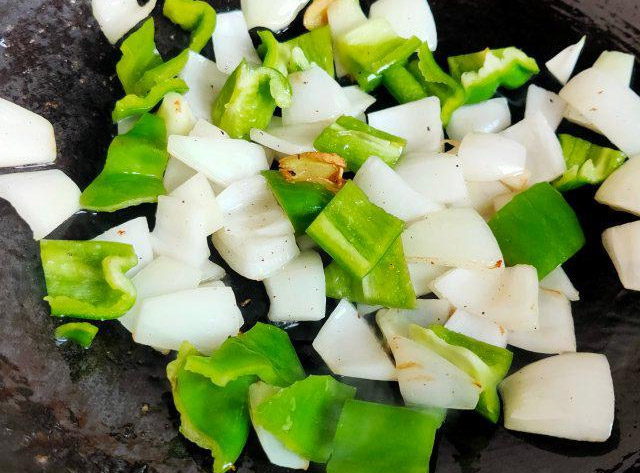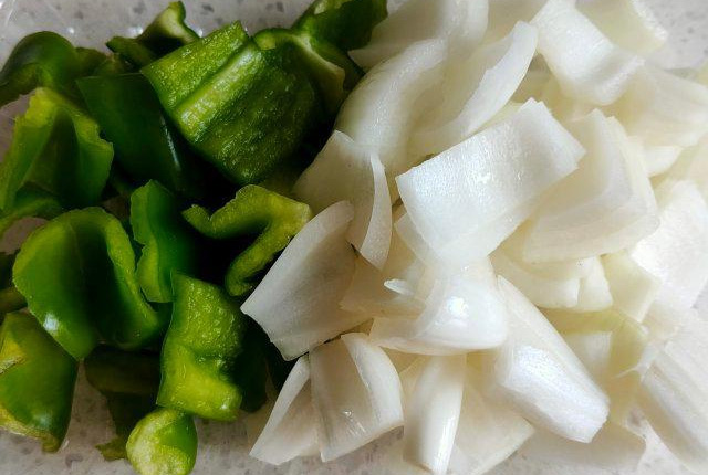 第2步、青椒洋葱切成小块儿。