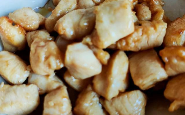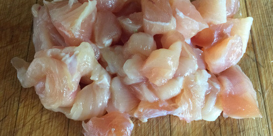 第1步、鸡胸肉一块,切成小丁,加少许盐,料酒,胡椒粉,蚝油,蚝油抓匀入味,腌制一下。