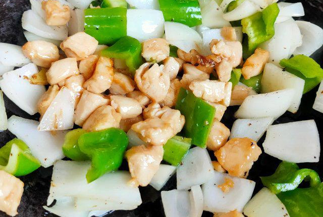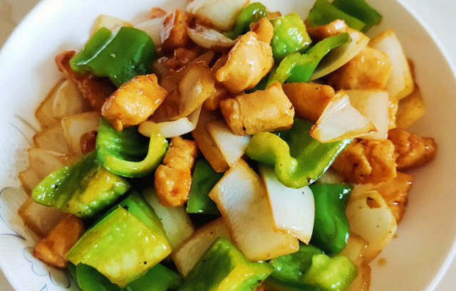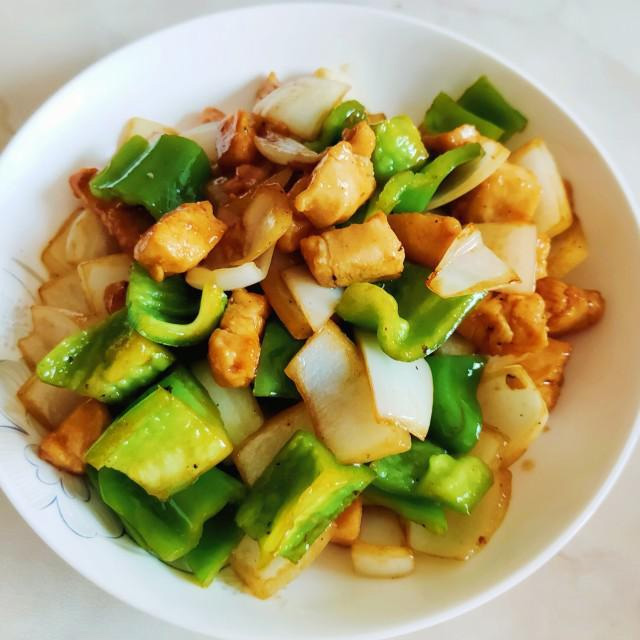 原料:鸡胸肉、青椒、洋葱、盐、胡椒粉、料酒、蚝油、生抽、香醋、姜片。