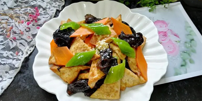 北豆腐,胡萝卜,尖椒,木耳,瘦肉,盐,葱姜,干辣椒,老抽