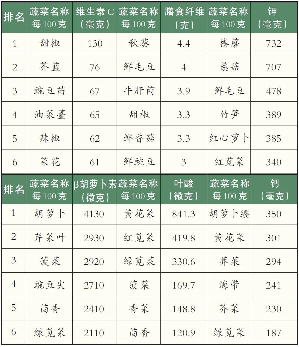 根据《中国食物成分表》中的相关数据,康瑞雪为大家总结不同蔬菜的营养素排名: