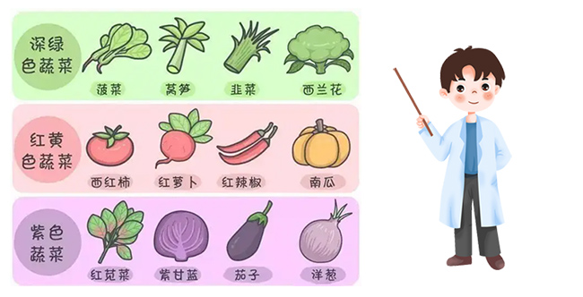 深色蔬菜还含有丰富的植物化学物、芳香类物质和天然的植物色素。按照不同颜色划分,“色号”较深的蔬菜营养各有优势:
